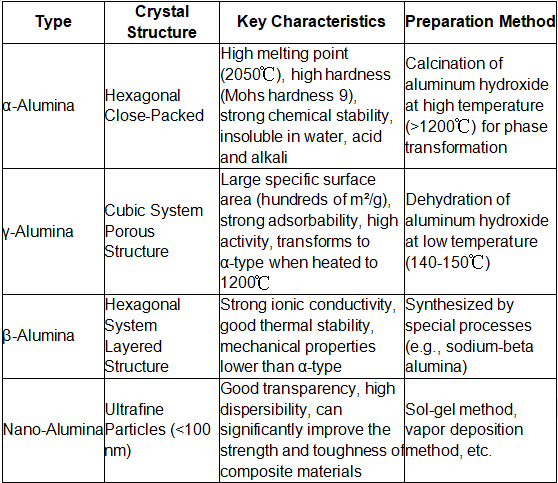Pagrindinė aliuminio oksido miltelių klasifikacija grindžiama jų kristalų struktūra ir paruošimo procesu. Įprasti tipai ir jų savybės yra šios: